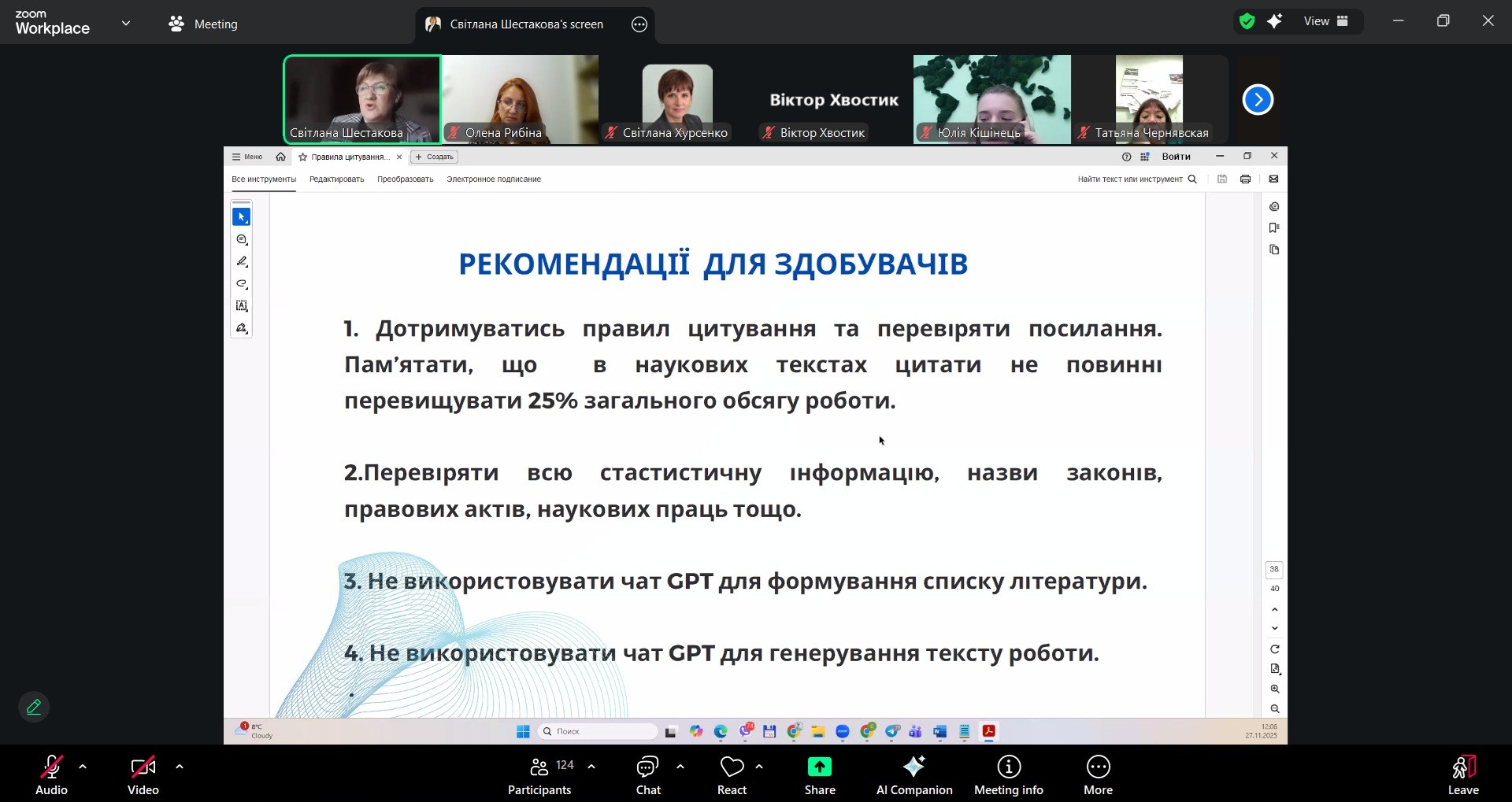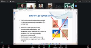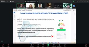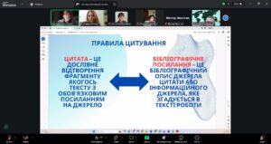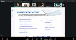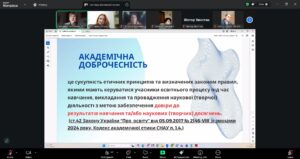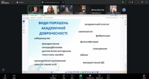 Лекторка – Світлана ШЕСТАКОВА, кандидатка філологічних наук, доцентка, завідувачка кафедри державно-правових дисциплін та українознавства, – поділилася актуальною і корисною інформацією щодо поняття академічної доброчесності, видів порушення академічної доброчесності та відповідальності за ці порушення. Були розглянуті види академічного плагіату та програми, що використовуються для його виявлення. Особливий акцент було зроблено на рекомендації щодо запобігання академічному плагіату в наукових роботах та коректного оформлення цитат, посилань, бібліографічних списків. Тема майстер-класу викликала жваве обговорення учасників.