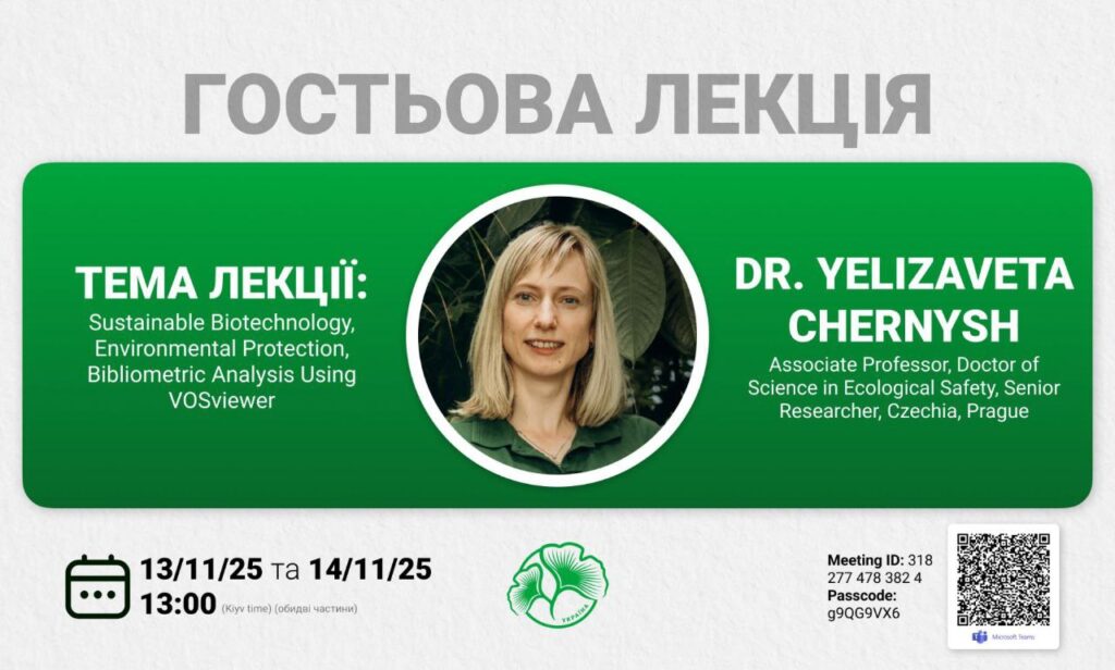 13 та 14 листопада 2025 викладачі й здобувачі спеціальностей Н7 Агроінженерія, G3 Електрична інженерія та G11 Машинобудування (за спеціалізацією) всіх ступенів вищої освіти запрошуються до участі у гостьовій онлайн-лекції, яку прочитає Dr. Yelizaveta Chernysh. Тема: _Sustainable Biotechnology, Environmental Protection, Bibliometric Analysis Using VOSviewer.