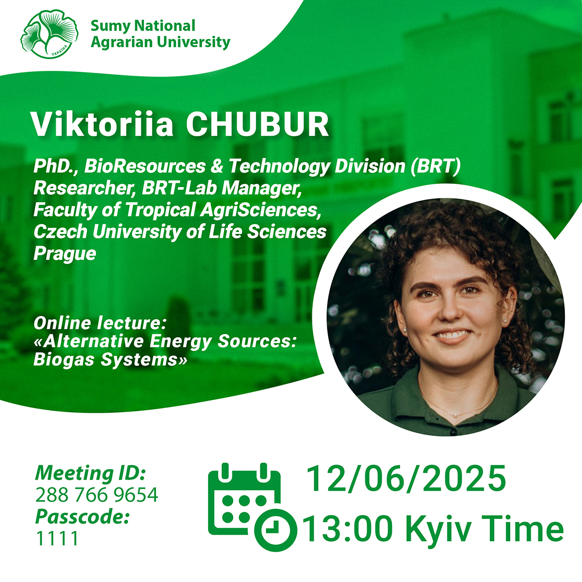 Запрошуємо вас на гостьову лекцію «Alternative Energy Sources: Biogas Systems», яка проводиться в рамках міжнародної співпраці між Сумським національним аграрним університетом та Чеським університетом природничих наук (м. Прага).