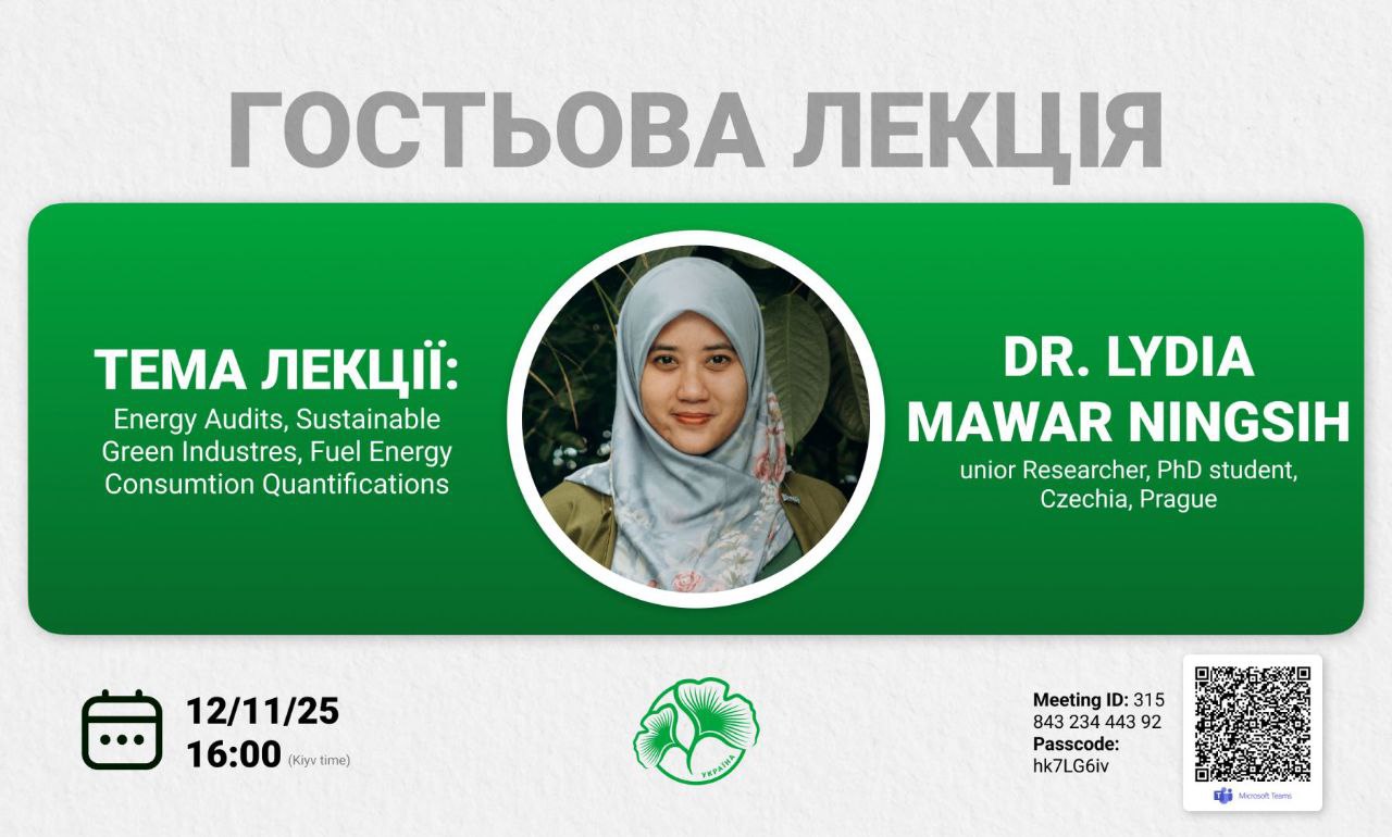 Запрошуємо вас взяти участь у гостьовій онлайн-лекції, яку прочитає Dr. Lydia Mawar Ningsih. Тема: Energy Audits, Sustainable Green Industries, Fuel Energy Consumption Quantifications