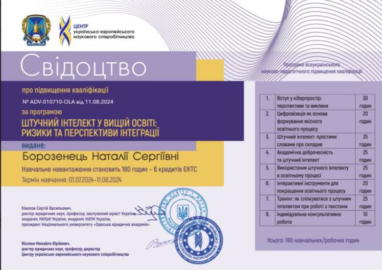 5. Всеукраїнське науково-педагогічного підвищення кваліфікації за програмою «ШТУЧНИЙ ІНТЕЛЕКТ У ВИЩІЙ ОСВІТІ: РИЗИКИ ТА ПЕРСПЕКТИВИ ІНТЕГРАЦІЇ» – 01липня по 11серпня 2024 р. – Борозенець Наталія Сергіївна