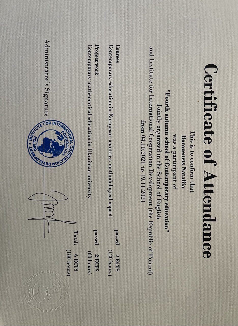 19. Міжнародне стажування “Frouth autumn school of Contemporary educatson” Jointly organized in the School of English Institute of International Cooperation Development (the Republic of Poland) from 04.10.2021 to 19.11.2021 – Борозенець Наталія Сергіївна