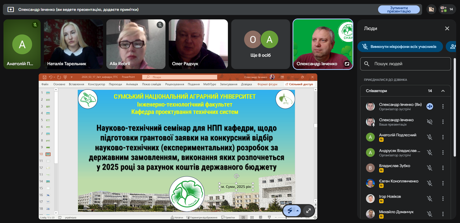 На кафедрі «Проектування технічних систем» Сумського національного аграрного університету 07.10.2025 відбулася важлива подія для наукової спільноти – науково-технічний семінар, присвячений особливостям підготовки заявок на конкурсний відбір науково-технічних розробок за державним замовленням. Виконання цих проєктів розпочнеться у 2026 році за рахунок коштів державного бюджету.