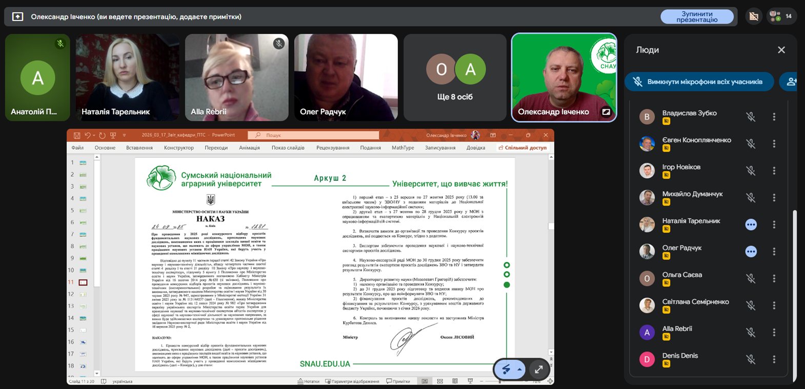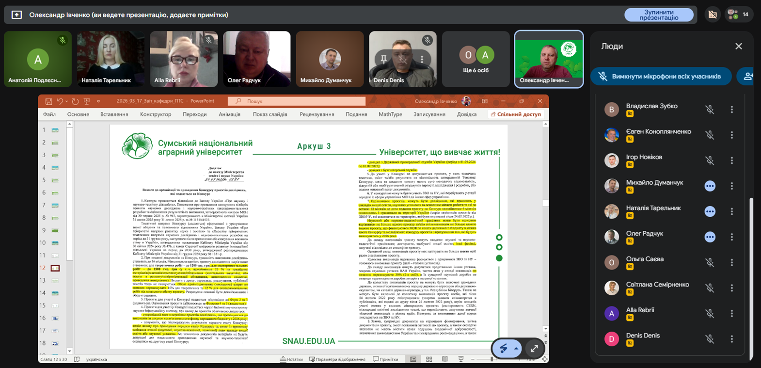 Під час семінару було детально проаналізовано Наказ МОН України № 1281 від 24.09.2025, який регламентує проведення конкурсного відбору проєктів фундаментальних та прикладних наукових досліджень. Олександр Івченко наголосив на важливості дотримання термінів: перший етап відбору в межах університету триває до 27 жовтня 2025 року, після чого матеріали подаються до Національної електронної науково-інформаційної системи для проходження другого етапу експертизи.