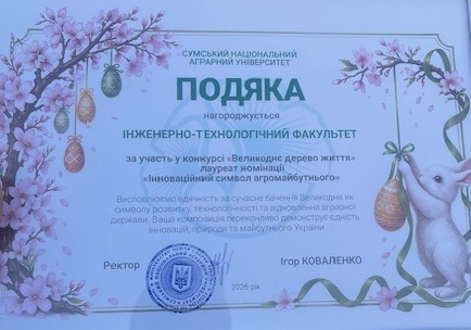 У результаті чесної та натхненної конкурсної боротьби інженерно-технологічний факультет був відзначений подякою за участь у конкурсі «Великоднє дерево життя», а також здобув почесне звання лауреата в номінації «Інноваційний символ агромайбутнього».