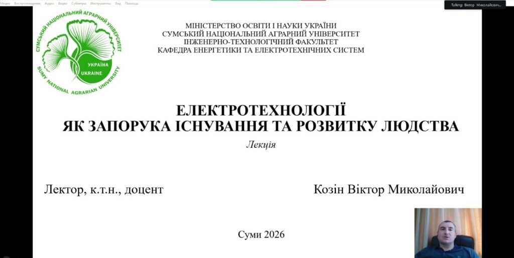 14 квітня 2026 року об 11:00 відбулася гостьова онлайн-лекція к. т. н., доцента кафедри енергетики та електротехнічних систем СНАУ Віктора КОЗІНА на тему «Електротехнології як запорука існування та розвитку людства». Уже сама назва задала високий інтелектуальний тон зустрічі: йшлося не лише про електрику як технічне явище, а про електротехнології як про одну з базових опор сучасної цивілізації, без якої сьогодні неможливо уявити ані промисловість, ані транспорт, ані медицину, ані повсякденне життя.