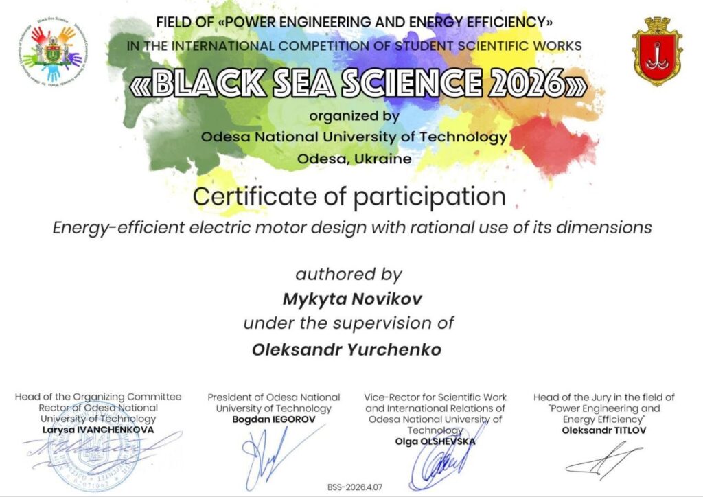 Здобувач 2 ст курсу групи ЕТЕС 2401 ст Микита НОВІКОВ прийняв участь у Міжнародному конкурсі студентських наукових робіт “Black Sea Science 2026”.
