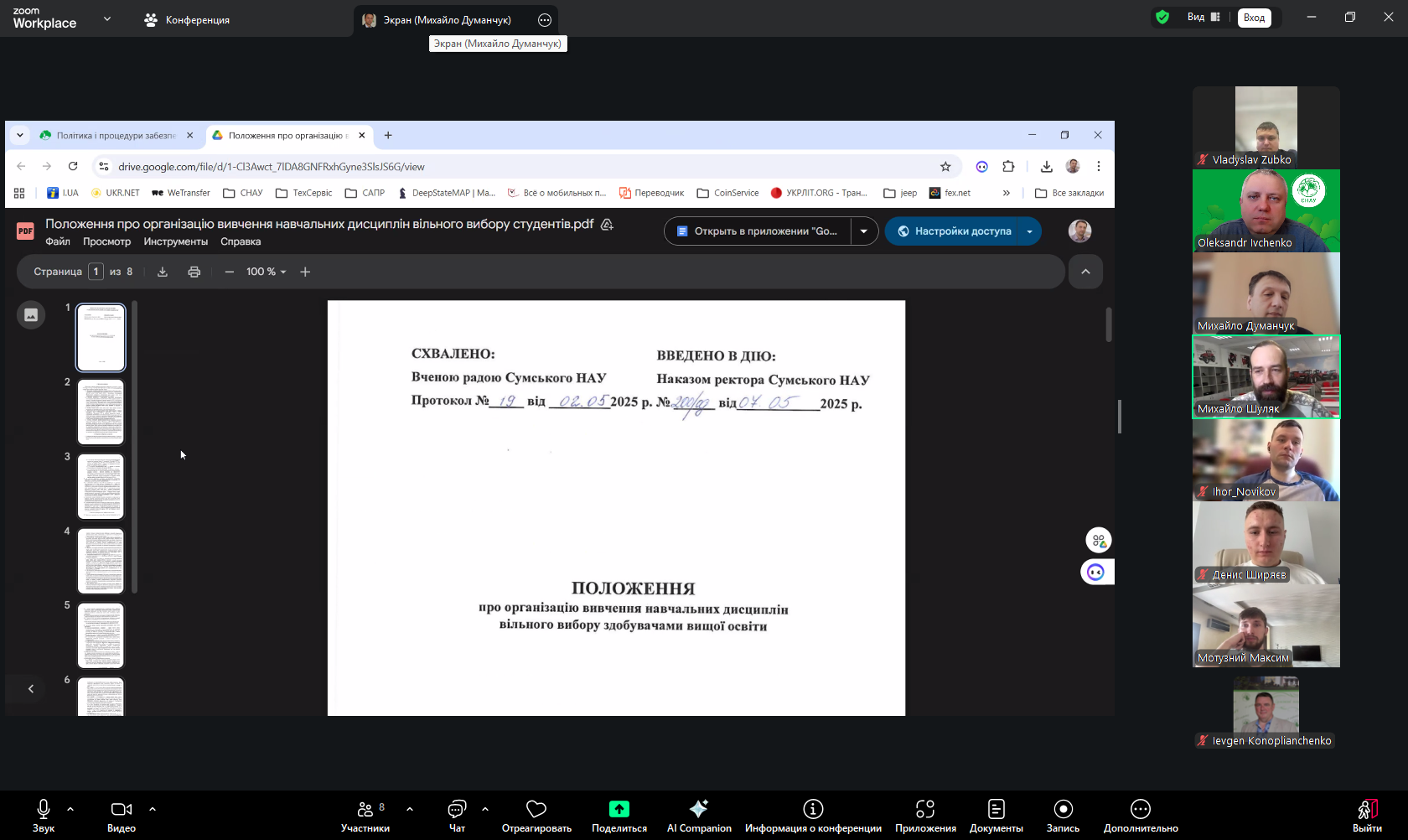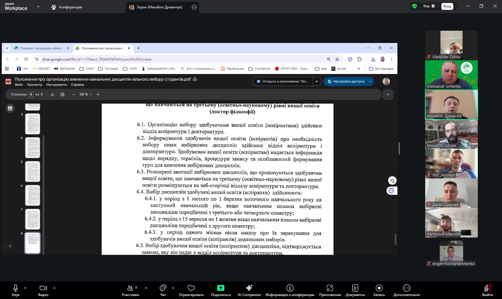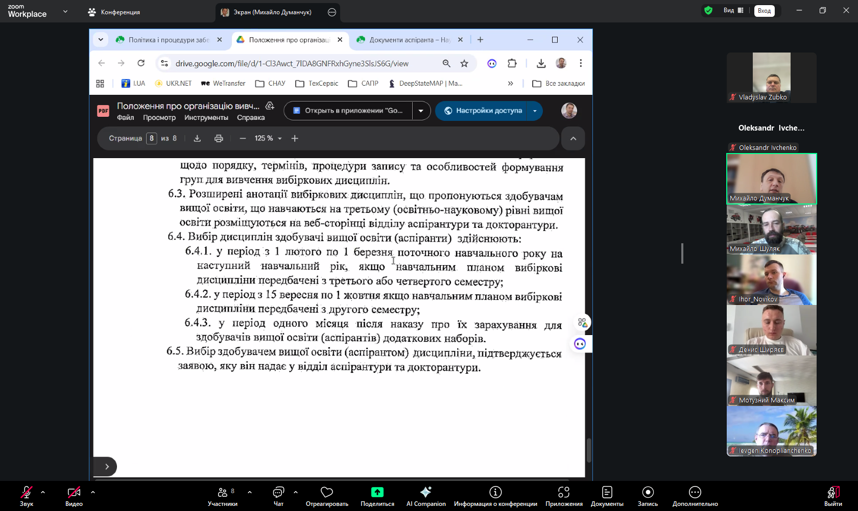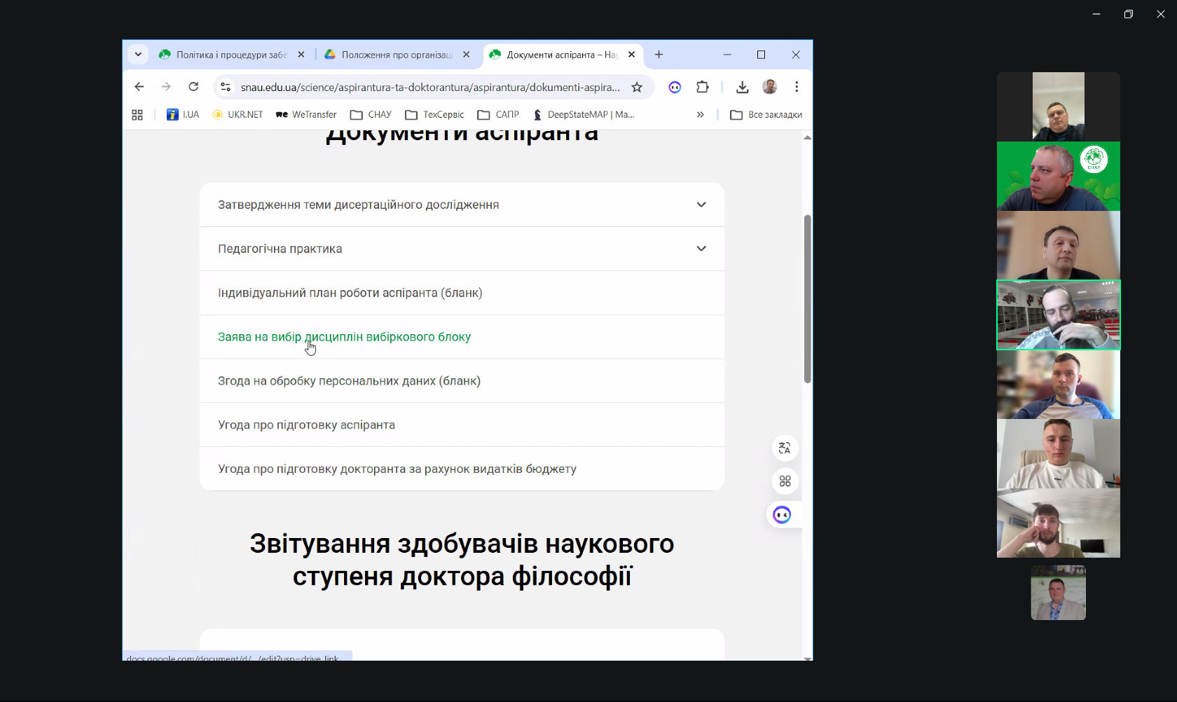 Михайло ДУМАНЧУК розповів здобувачам ВО процедуру вибору дисциплін. Було повідомлено про послідовність їх дій та нормативні документи, якими вони повинні користуватися. Зазначено, що процедура вибору буде відбуватися на протязі місяці з 01 лютого по 01 березня. За цей час здобувачі повинні визначитися з вибором та надати відповідну заяву до відділу аспірантури.