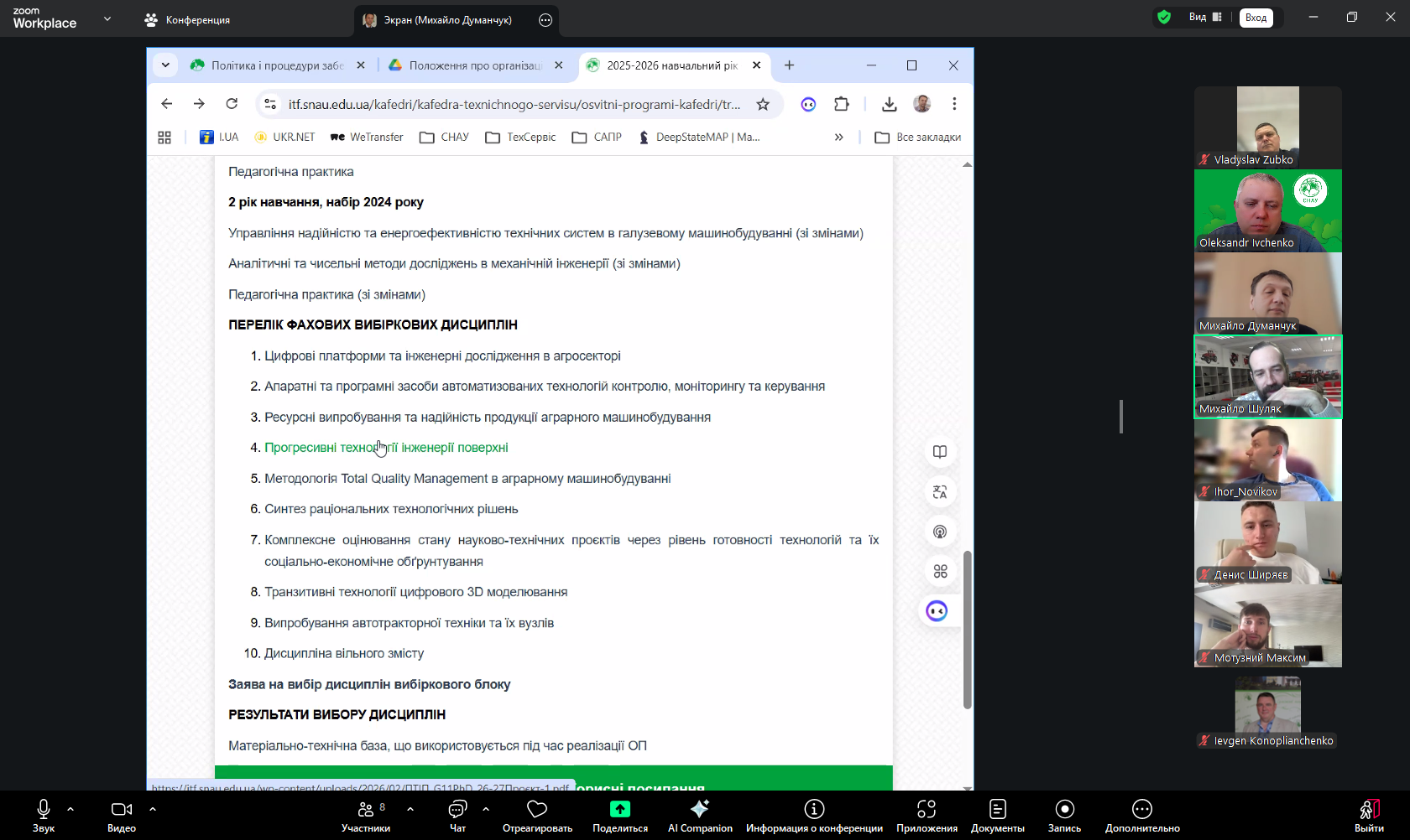 Михайло ДУМАНЧУК зазначив, що здобувачі можуть обрати три з десяти освітніх компонентів. Також він звернув увагу на ВК 10. Цей компонент включений в ОНП і дозволяє здобувачу звернутися до конкретного викладача та погодити з ним зміст вибіркової ВК (у межах компетентності викладача) та обрати саме її. Гарант ОНП повідомив, що на сайті розміщені проєкти ще не затверджених ВК і здобувачі після вибору можуть звернутися до викладача та погодити з ним зміни чи цікаві теми.